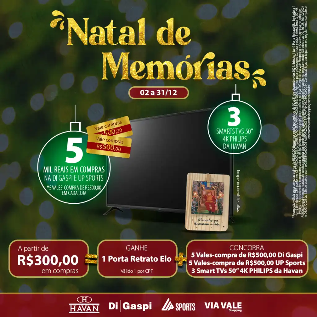 O Empreendimento celebra a data com prêmios incríveis, um toque de memórias inesquecíveis e horários especiais. Neste final de ano, o Via Vale Shopping convida você a viver a magia do Natal de um jeito especial com quem mais ama. Com o mote “Natal de Memórias”, a campanha deste ano celebra os momentos que aquecem o coração e nos conectam às pessoas importantes em nossas vidas. De 02 a 31 de dezembro, a cada R$300,00 em compras, você garante um presente exclusivo: 1 Porta-retrato Elo (Válido 1 por CPF), perfeito para eternizar suas melhores lembranças. Além disso, você ainda participa do sorteio de prêmios incríveis que tornarão o seu fim de ano inesquecível.